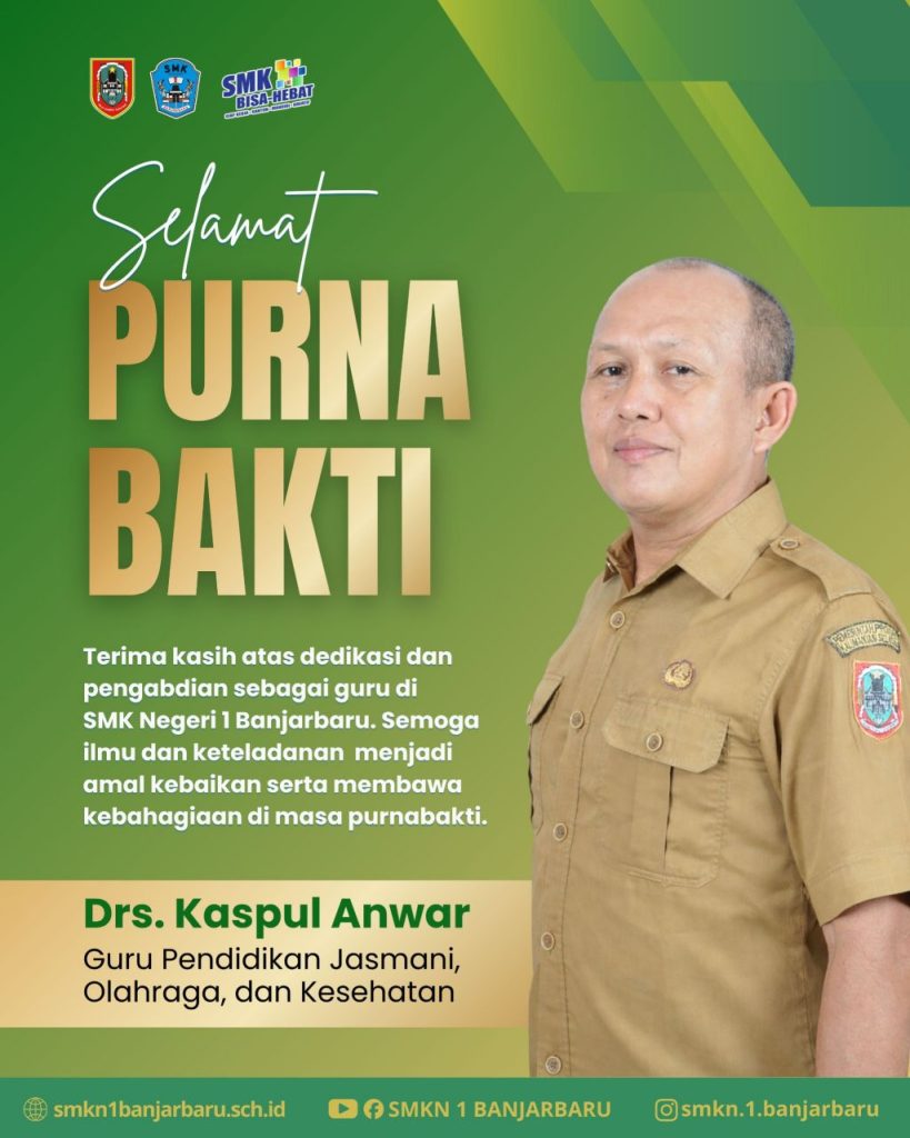 Dengan penuh rasa hormat dan penghargaan, keluarga besar SMK Negeri 1 Banjarbaru mengucapkan terima kasih yang sebesar-besarnya atas dedikasi, pengabdian, dan ketulusan Bapak selama menjalankan amanah sebagai Guru Pendidikan Jasmani, Olahraga, dan Kesehatan.